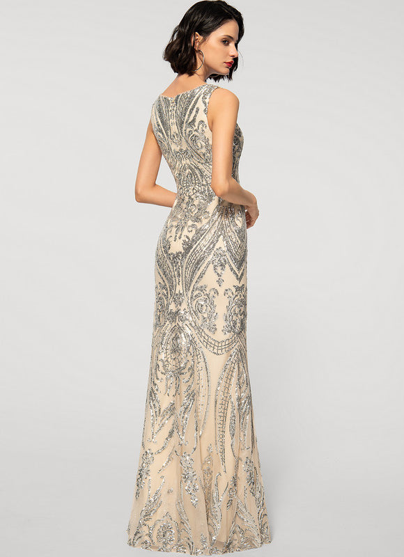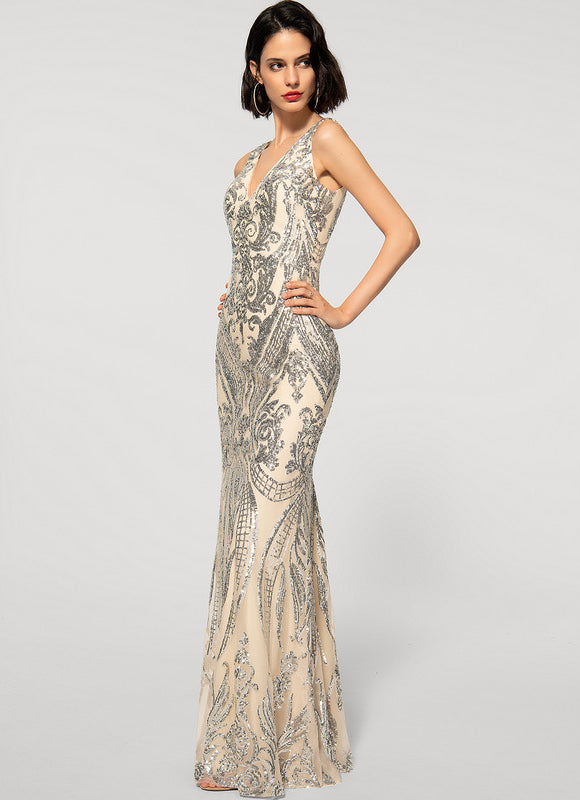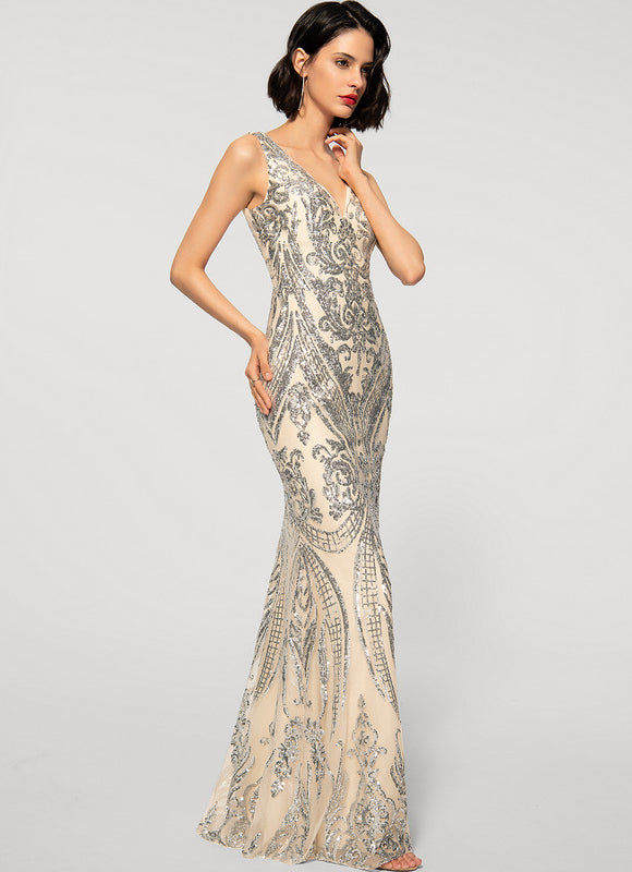 Chaque détail de cette robe a été pensé pour sublimer votre allure. Le tissu entièrement recouvert de paillettes crée un jeu de lumière hypnotisant à chaque mouvement, vous enveloppant d'un voile de glamour. Son col en V plongeant met en valeur votre décolleté avec subtilité, tandis que le dos en V ajoute une touche de sophistication inattendue. La fente élégante sur la jambe dévoile juste ce qu'il faut pour une démarche fluide et sensuelle, vous permettant de vous déplacer avec aisance et assurance. C'est la robe parfaite pour celles qui rêvent d'un look de tapis rouge sans compromis sur le confort.