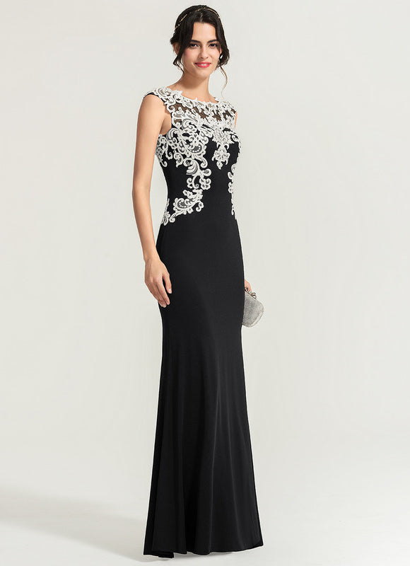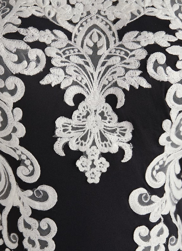 Plongez dans les détails de cette création unique. Le col rond de la Robe Fourreau Sérénité Nocturne encadre élégamment votre cou et met en valeur votre port de tête, offrant une touche de sophistication discrète. Le véritable spectacle réside dans la somptueuse dentelle qui orne le buste et se prolonge avec art sur le dos en un magnifique style illusion. Cette dentelle, d'une finesse remarquable, crée un contraste saisissant avec le tissu uni de la robe, ajoutant une profondeur visuelle et un charme intemporel. L'absence de fente sur la jambe assure une silhouette continue et fluide, accentuant l'allure majestueuse de cette robe longue, parfaite pour les occasions où l'élégance prime.