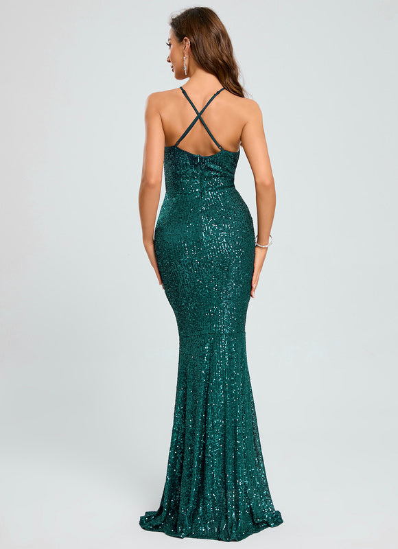 Cette robe n'est pas qu'un vêtement, c'est une expérience. Le choix du tissu en paillettes n'est pas anodin : il est là pour que vous scintilliez littéralement. Chaque petite paillette verte a été pensée pour refléter la lumière d'une manière qui met en valeur votre silhouette. Son design fourreau épouse délicatement vos courbes jusqu'aux genoux, avant de s'évaser légèrement, évoquant la queue majestueuse d'une sirène – d'où son allure sirenesque. Le col licou audacieux met en valeur vos épaules et votre dos avec élégance, offrant une touche de sensualité raffinée. Malgré son allure spectaculaire, la robe est entièrement doublée pour un confort optimal, vous permettant de danser et de vous déplacer avec aisance toute la soirée. La fermeture éclair discrète au dos assure un ajustement parfait et un enfilage facile.